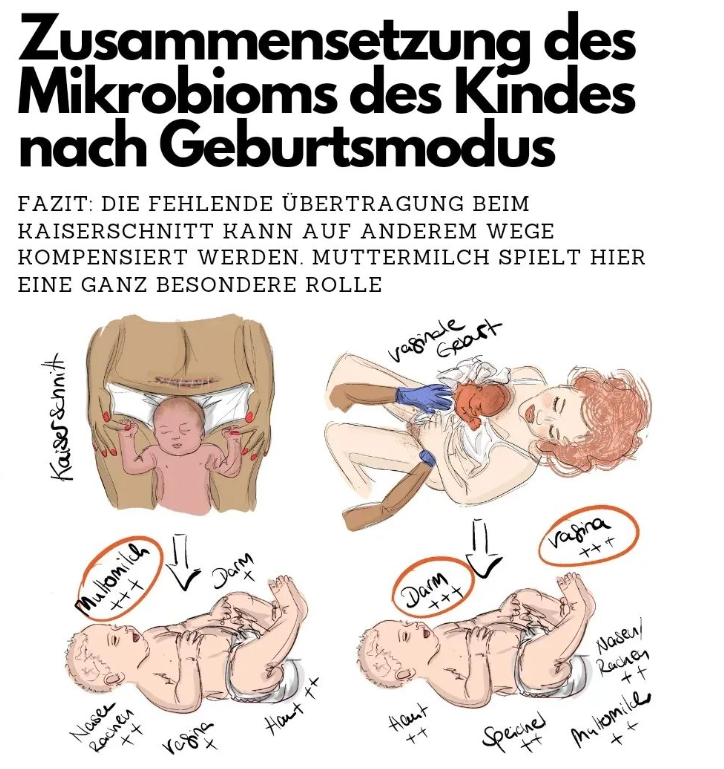 Die Übertragung des Mikrobioms von der Mutter auf den Säugling erfolgt über unterschiedliche Wege und Körperareale